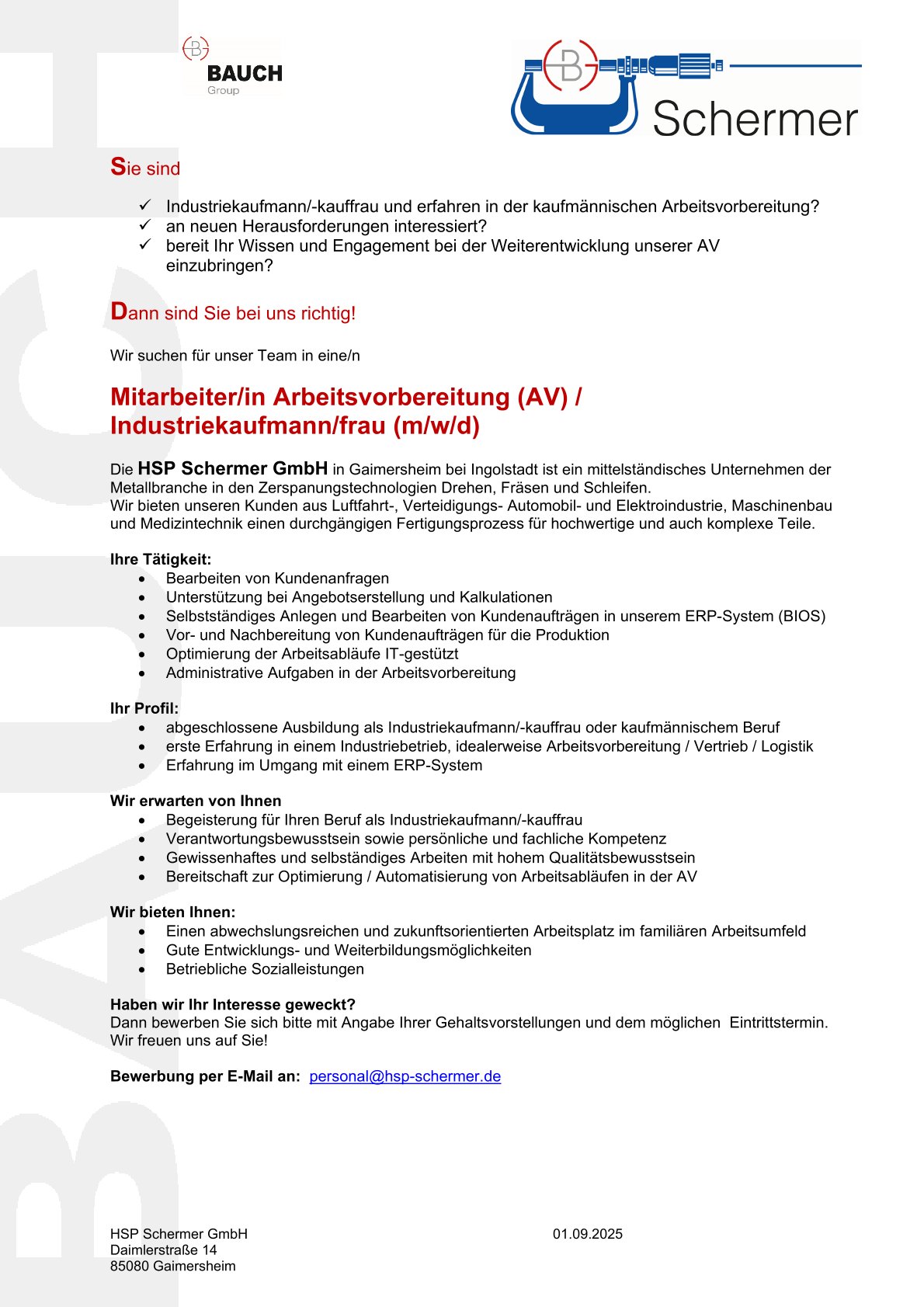 Mitarbeiter/in Arbeitsvorbereitung (AV) / Industriekaufmann/frau (m/w/d)